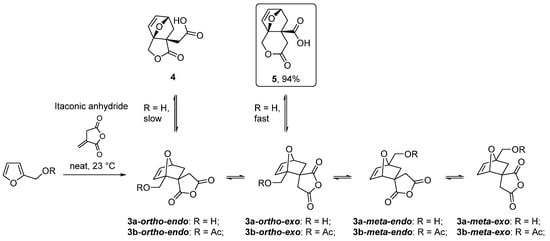 1 Yield of DA adduct after hydrogenation. 2 Endo- and exoconformation with regard to the position of the OAc group. 3 Structure of regio- and diastereomers in DA cycloaddition of C-2-substituted furans with itaconic anhydride are provided in Scheme 5. 4 Was detected by NMR. N.d.—not determined.