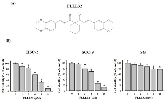 FLLL32 inhibits cell viability in oral cancer cells. (A) The chemical structure of FLLL32. (B) The cell viabilities of HSC-3, SCC-9, and SG were measured by an MTT assay after treatment with 0, 1, 2, 4, 8, or 16 μM of FLLL32 for 24 h. Data are presented as the mean ± SD, and all experiments were independently repeated at least three times; * p < 0.05 compared with the vehicle group.