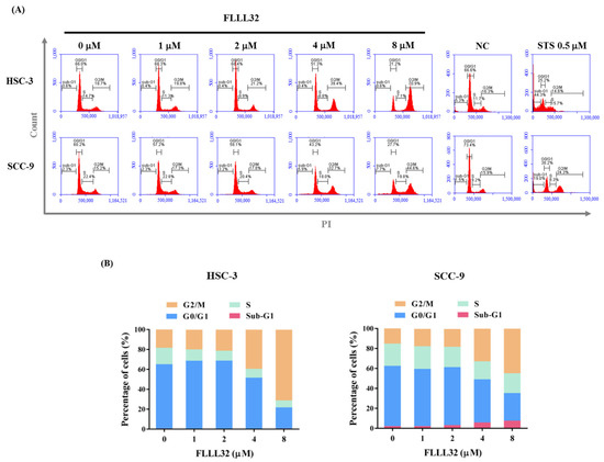 Next, to determine the cell growth inhibition effect of FLLL32, HSC-3 and SCC-9 cells were stained with PI and analyzed for DNA content by flow cytometry following FLLL32 treatment (0, 1, 2, 4, and 8 μM). As shown in Figure 2A,B, FLLL32 significantly increased the proportion of G2/M-phase cells in both HSC-3 and SCC-9 cell lines. To verify whether the growth inhibition effect by FLLL32 was caused by cell apoptosis, annexin V–FITC/PI double staining was applied. As shown in Figure 3A,B, FLLL32 significantly increased the proportion of apoptotic cells after 24 h.