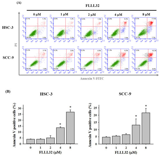 FLLL32 induces cell apoptosis in oral cancer cells. (A) HSC-3 and SCC-9 cells were treated with 0, 1, 2, 4, or 8 μM FLLL32 for 24 h and subjected to flow cytometry after annexin V–FITC/PI staining. (B) The quantitative percentage of apoptotic cells, including early apoptotic and late apoptotic cells, was increased by FLLL32 in HSC-3 and SCC-9 cells in a dose-dependent manner. Data are presented as the mean ± SD, and all experiments were independently repeated at least three times; * p < 0.05 compared with the vehicle group.