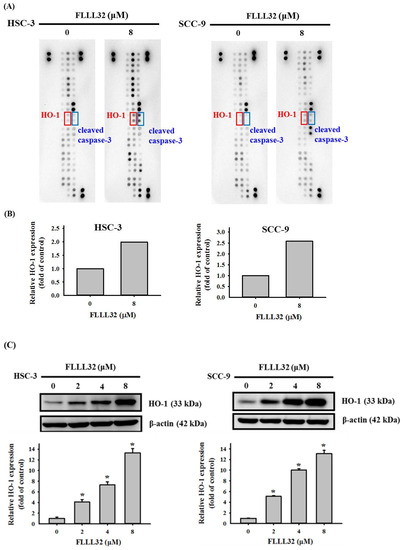 In order to understand the mechanism of FLLL32 in inducing the apoptosis of oral cancer cells, the Human Apoptosis Array was used to analyze 35 proteins related to the apoptosis pathway. HSC-3 and SCC-9 cells were treated with FLLL32 (8 μM) for 24 h, and the Human Apoptosis Array was performed to observe the expression of apoptosis-related proteins. As shown in Figure 4A,B, the expression of cleaved caspase-3 and HO-1 proteins increased in both oral cancer cell lines after treatment with FLLL32 (8 μM). These results were confirmed by Western blot, which suggested that HO-1 protein levels were significantly increased in both oral cancer cell lines (Figure 4C).