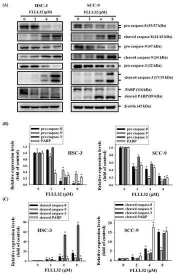 FLLL32 induces the activation of caspase-8, -9, -3, and PARP in oral cancer cells. (A) HSC-3 and SCC-9 cells were treated with FLLL32 (0, 2, 4, or 8 μM) for 24 h, and the protein levels of pro- and cleaved caspase-8, -9, -3, and PARP were analyzed by Western blot. The β-actin protein was used as a loading control. (B) Quantitative results of pro-caspase-8, -9, -3, and PARP from (A). (C) Quantitative results of cleaved caspase-8, -9, -3, and PARP from (A). β-actin protein levels were used to adjust the quantitative results of protein levels; * p < 0.05 compared with the vehicle group.