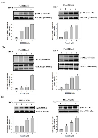 FLLL32 induces the activation of p-ERK, p-JNK, and p-p38 in oral cancer cells. HSC-3 and SCC-9 cells were treated with FLLL32 (0, 2, 4, or 8 μM) for 6 h, and the protein levels were analyzed by Western blot and then quantified by Image J. (A) Protein levels of p-ERK and total ERK. (B) Protein levels of p-JNK and total JNK. (C) Protein levels of p-p38 and total p38. The total protein levels of ERK, JNK, and p38 were used to adjust the quantitative results of protein levels; * p < 0.05 compared with the vehicle group.