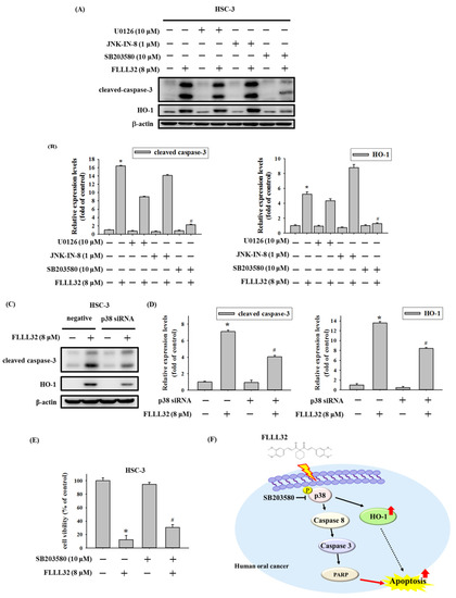 Involvement of p38 in FLLL32-induced activation of caspase-3 and HO-1. (A) HSC-3 cells were pretreated with U0126 (10 μM), JNK-IN-8 (1 μM), or SB203580 (10 μM) for 2 h, before treatment with FLLL32 (8 μM) for 24 h. The protein levels of cleaved caspase-3 and HO-1 were analyzed by Western blot. (B) Quantitative results of the protein levels of cleaved caspase-3 and HO-1 from (A). β-actin protein levels were used to adjust the quantitative results of protein levels. (C) The combined effect of p38 siRNA and FLLL32 (8 μM) on cleaved caspase-3 and HO-1 was analyzed by Western blot. (D) Quantitative results of the protein levels of cleaved caspase-3 and HO-1 from (C). β-actin protein levels were used to adjust the quantitative results of protein levels. (E) The combined effect of SB203580 (10 μM) and FLLL32 (8 μM) on cell viability; * p < 0.05 compared with the vehicle group; # p < 0.05 compared to the FLLL32-only treated group. (F) Proposed model for the anticancer effects of FLLL32 in oral cancer cells. In oral cancer cells, curcumin analog FLLL32 can induce cell apoptosis by activating caspase-3, PARP, and HO-1 through the p38 pathway.