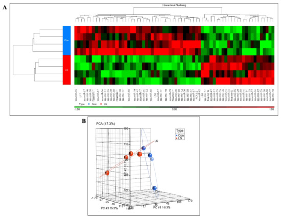 Genome-wide microRNA profiling of LS patients. (A) Hierarchical cluster analysis (Pearson’s Dissimilarity, Ward’s method) performed for 68 differentially-expressed miRs (p < 0.05 and fold-change difference = 1.5), with four LS and four control samples. (B) Principal component analysis (PCA) display of four LS (red dots) and four control (blue dots) samples used in the experiment. PCA demonstrated a good discrimination between groups.