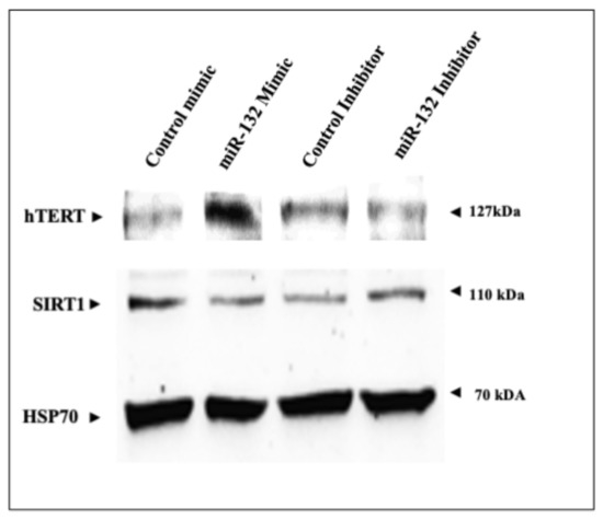 To establish whether changes in SIRT1 and hTERT mRNA levels detected by qRT-PCR were correlated with parallel changes in protein levels, HEK293T cells were transfected with miR-132-3p mimics or inhibitor for 24 h, after which, total protein was isolated and SIRT1 and hTERT levels were measured by Western blots. Results obtained indicate that SIRT1 levels in mimics-transfected cells were lower than in control cells (Figure 4). On the other hand, SIRT1 levels were higher in miR-132-3p inhibitor-transfected cells. hTERT expression levels in miR-132-3p mimic-transfected cells were higher than in controls, while levels in miR-132-3p inhibitor-transfected cells were lower than in controls. These results indicate that changes in SIRT1 and hTERT protein levels upon miR-132-3p manipulation correlate with SIRT1 and hTERT mRNA expression.
