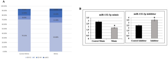 Next, experiments were carried out aimed at evaluating the impact of miR-132-3p on cell cycle progression. To this end, HEK293T cells were transfected with mirVana™ miR-132-3p mimics, after which, the distribution of cells in the different phases of the cell cycle was analyzed by flow cytometry (Figure 5A). The proportion of cells in the G0/G1 phase was substantially decreased in the mimics group (from 70.52% in control cells to 63.80% in mimic-treated cells). Concomitantly, the proportion of cells in the S phase was increased (from 8.63% in control cells to 11.4% in mimic-treated cells). These data suggest that miR-132-3p mimic-treated cells moved from the G0/G1 phase (7% less cells) towards the S phase (3% more cells) compared to the control. Taken together, these results indicate that miR-132-3p might be involved in the regulation of cell cycle progression through G0/G1 to S transition.