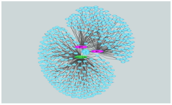 Graphic representation of the IGF1, miR-132-3p-SIRT1 loop. Network visual analysis of predicted targets of miR-132-3p and two key genes, SIRT1 and IGF1. The analysis identified 1668 entries of miR-gene interactions, which are presented using Cytoscape v. 3.7.2. miR-132-3p is presented in green and SIRT1 and IGF1 are presented in pink. All other interactions are shown in smaller light blue ellipses.