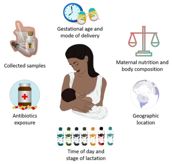In recent years, it has been established that HM microbiota composition is highly influenced by genetic, maternal and early-life factors (gestational age, delivery mode, maternal nutrition and body composition, time of day and stage of lactation, intake of antibiotics, and geographic location), which cause substantial inter-individual variation in its composition [55] (Figure 1).