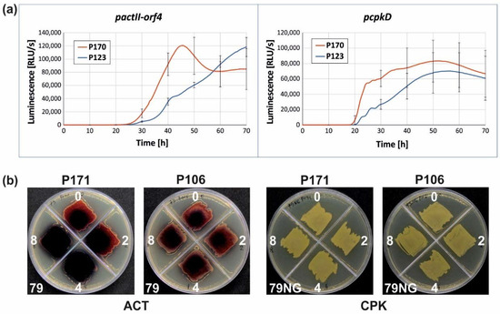 The influence of SCO3932 constitutive overexpression on the activity of actII-orf4 and cpkD promoters was investigated in the luciferase reporter system as described before in Bednarz et al., 2021 [12]. Both promoters were found to be more active in SCO3932 overexpression strain P170 than in the control strain P123 with an “empty” control plasmid (Figure 6a). Phenotypic observations showed that ACT production was enhanced in the strain P171, in which SCO3932 overproduction was induced, in comparison to the control strain P106. CPK secretion was similar in both strains (Figure 6b).