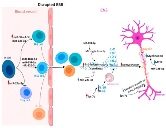 Potential role of circulating microRNAs (miRNAs) involved in multiple sclerosis (MS) pathogenesis, which could be useful in discriminating between relapsing-remitting multiple sclerosis (RRMS) and secondary progressive multiple sclerosis (SPMS) (miR-145-5p, miR-181c-5p, miR-223-3p, miR-27a-3p, miR-326-5p, miR-92a-1-3p, let-7c, let-7d, miR-337-3p, miR-633-5p). Upregulation and downregulation of specific miRNAs influence the Th cell differentiation into pro-inflammatory Th17 and Th1 cells, which together with B cells can cross the blood–brain barrier (BBB) and migrate to the central nervous system (CNS), where they proliferate and secrete pro-inflammatory cytokines (interleukin-1 (IL-1), IL-6, IL-17, interferon-γ (IFN-γ), and tumor necrosis factor α (TNF-α)). In the CNS, different miRNAs play various roles in cytokine secretion, monocyte stimulation, or neuronal maturation. As a consequence, dysregulation of these processes causes myelin sheath damage and, eventually, neuronal loss. Red arrow—upregulation of specific miRNA in MS compared to healthy controls; increased effect exerted by a given miRNA. Blue arrow—downregulation of specific miRNA in MS compared to healthy controls; decreased effect exerted by a given miRNA.