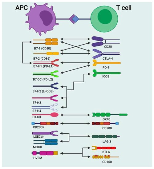 CD4+ T cells require three complementary signals to become fully activated—the T-cell receptor (TCR) signal, co-stimulation/inhibition signals, and cytokine priming. The first signal confers specificity to the immune response and plays an essential role in recognizing antigen presentation by MHC-II on the surface of APCs. However, this signal alone is not sufficient to fully activate these T cells. For full efficacy, T cells need a second, non-specific co-stimulatory signal. The coupling between APCs and naive T cells will signal surface molecules expressed on T cells and APCs. Both express co-stimulatory molecules such as CD80 and CD86, which belong to the B7 family. These molecular interactions modulate T cell function by binding to CD28 or cytotoxic T-lymphocyte-associated antigen 4 (CTLA-4) receptors; this interaction has been observed to have opposing effects depending on the different environmental signals. CTLA-4 inhibits T-cell responses and regulates peripheral T-cell tolerance. At the same time, CD28 promotes T-cell activation and survival. Finally, cytokines control differentiation into different effector cells that deliver signals such as IL-4, IL-5, IL-13, INFs, and proinflammatory cytokines [1]. This finding shows that these immunological checkpoint molecules have a role in fine-tuning the T-cell response by mediating stimulatory and inhibitory signals.
