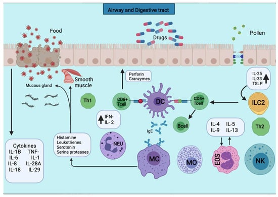 The allergic inflammatory process involves different cell types that release a range of inflammatory mediators and cytokines. Th2 cytokines, including IL-4, IL-5, and IL-13, induce IgE production, while IL-5 promotes eosinophil infiltration [4,5]. Other factors, including Th1 cytokines, may sometimes affect the clinical manifestation creating a potential tolerance induction or hyperactivity [6]. Moreover, the progression of allergy disease is mediated by the innate immune system on the respiratory or gastrointestinal tract mucosa. Indeed, antigen-presenting cells (APCs) become activated, and epithelial alarmins (IL-25, IL-31, IL-33, and TSLP) are released due to activation of the airway epithelial cells in response to allergens [7], leading to activation of Th2/mast cell/eosinophil/eosinophil-mediated allergic pathology, including IL-4 and IL-5. Another pathway is the Th1/Th17/neutrophil-mediated response to chronic innate immune activation and irreversible airway obstruction [8,9]. In addition, the high cellular plasticity in the context of type-2-driven inflammation refers to the capacity of T-helper cell subpopulations to respond depending on environmental signals differentiating into other effector cell types. For example, in chronic asthma, Th1 and Th2 cytokines contribute to airway wall remodeling. Another group of cells that respond to environmental signals are group 2 innate lymphoid cells that exhibit a dynamic phenotype in allergic airway inflammation [10]. Allergic diseases such as asthma are heterogeneous with multiple conditions. The molecular phenotypes defined based on the predominant inflammatory cell are endotypes. In this context, the type 2 immune response can be categorized into different subgroups, such as IL-5-high, IL-13-high, or IgE-high, and others [11].