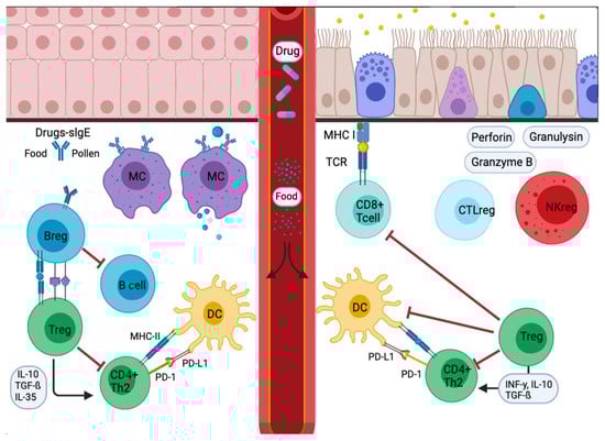 The roles of individual Treg subtypes in oral tolerance are poorly explored, but Foxp3+ Tregs, such as Foxp3-, produce TGF-β and IL-10 and may be found in the gut, and many of the Foxp3- Tregs are probably type 1 regulatory T cells (Tr1) that migrate peripherally [92]. The roles of individual Treg subtypes in oral tolerance are poorly explored, but Foxp3+ Tregs, such as Foxp3-, produce TGF-β and IL-10 and may be found in the gut, and many of the Foxp3- Tregs are probably type 1 regulatory T cells (Tr1) that migrate from the peripherally [97]. These are some tests in mice that have preceded the description of the facts involving PD1/PD-L1. On the other hand, there is research on immuno-tolerance produced in cancer and autoimmunity trials where knockout mice have been used and for allergy treatments. There are also others in which inflammatory pathologies of the small and large intestine are described in which the behavior of immunosuppression is very similar to those of food allergies, as in the case of the reports by Bertolini et al. and Nakanishi et al. [90,98].