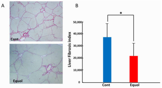 Male OLETF rats were supplied by Otsuka Pharmaceutical Co. (Tokushima, Japan) [17]. Equol-rich soy product (SE5-OH) was supplied by Otsuka Pharmaceutical Co. At the age of eight weeks, the OLETF rats were divided into two groups. Each group consisted of six rats. Porcine serum (0.5 mL) was intraperitoneally injected in all rats twice a week for six weeks. Through drinking water, one group was treated with equol-rich soy product, SE5-OH (2000 mg/kg/day) which contained 0.65% equol, during the experimental period [40]. At the end of the experiment, the rats were anesthetized, their abdominal cavities were opened, and their livers were harvested for histological evaluation. All animal procedures were performed according to a standard protocol and in accordance with the NIH Guide for the Care and Use of Laboratory Animals. All experiments were approved by the Animal Care and Use Committee of Nara Medical University.