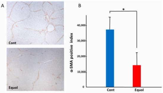 Effect of equol on the activated hepatic stellate cells (HSCs) in the OLETF rats. (A) Representative αSMA immunohistochemistry in OLETF rats (original magnification, ×40). (B) Semi-quantitative analysis of the αSMA-positive HSCs. The αSMA-positive cells were significantly suppressed by treatment with SE5-OH. Data represent the mean ± SD values. * p < 0.01, indicating a significant difference between groups.