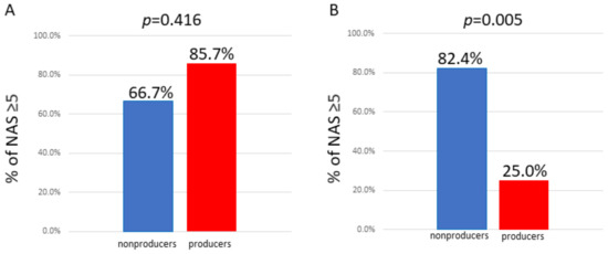 We compared the percentage of nonproducers and producers with NAS ≥ 5. We accordingly found that in men, the percentage of nonproducers with NAS ≥ 5 was not significantly different from that in producers. However, in women, the percentage of nonproducers with NAS ≥ 5 was demonstrated to be significantly higher than that of producers (Figure 3).