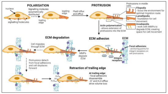 Flow chart of steps in cell invasion. Leading and trailing edges of cells form following asymmetric distribution of signaling molecules [71,72]. Fluid influx and efflux at the leading edge drives the formation of protrusions while actin polymerization facilitates extension into the ECM [73,74,75,76,77]. Focal adhesion proteins within the ECM bind integrin receptors on the cell surface, anchoring the cell to the ECM while metalloproteinases (MMPs) degrade the ECM [78,79]. Continuous detachment and reattachment of these anchorage points allows forward displacement of the cell through degrading ECM [80,81]. Complete disassembly of focal adhesion points and volume loss at the trailing edge terminates cellular invasion [76].