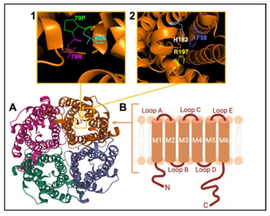 Schematic representation of the AQP channel structure. (A). View of the extracellular face of tetrameric AQP1, based on X-ray crystal structure for bovine AQP1 (Protein Data Bank 1J4N). (B). Membrane topography of an individual subunit with 6 helical transmembrane domains (M1-M6) connected by loops A to E. (Inset 1) View of Pro 79, Asp 80 and Asn 78 residues of the signature NPA motif. (Inset 2) View of His 182, Phe 58 and Arg 197 residues of the ar/R constriction selectivity filter.