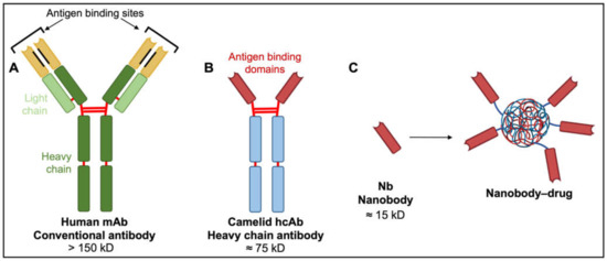 A new generation of tumor therapeutics is arising from the serendipitous discovery of heavy chain antibodies (hcAbs; Figure 5), naturally produced by all members of the camelid family. The hcABs exhibit high target specificity and binding capacities akin to those of mAbs, despite the absence of light chains and CH1 domains of heavy chains [154]. The two heavy chains constituting hcAbs are each associated with antigen-binding domains termed nanobodies (Nbs; Figure 5). These nanobodies contain the complementarity-determining regions that contribute to target diversity and specificity [147]. The strongly hydrophilic structure of nanobodies confers superior stability and solubility in vivo and overcomes aggregation problems associated with mAbs and mAb–drug conjugates [147]. Nanobody biodistribution after in vivo administration can be largely restricted to the tumor site, with small molecular size facilitating rapid extravasation and penetration into tumor tissue, thus providing substantial advantages over their larger mAb counterparts. Poor diffusion of mAbs into tumor tissues is associated with wider dispersal and increased risks of off-target effects [155,156,157,158]. Nanobodies as drug antagonists and vehicles for drug delivery in solid tumor models, including glioblastoma, are an exciting area of new investigation.