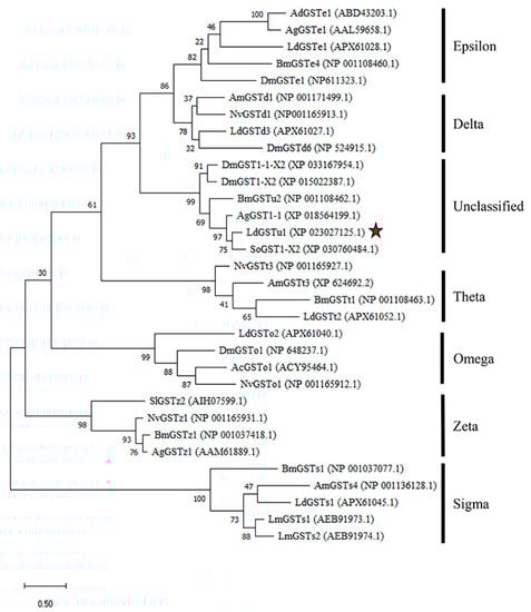 2.1. Phylogenetic Relationship of LdGSTu1 with Other Insect GSTs