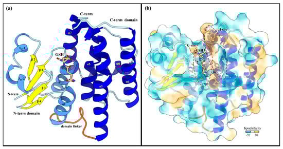 Global structure of LdGSTu1 (PDB ID: 7RKA). (a) Ribbon diagram of LdGSTu1 with GSH bound in the active site, showing secondary structural elements and the N-term and C-term domain structures. The N-term domain exhibits the thioredoxin-like fold (residues 1–77) and was complexed with GSH in chain A of the crystal structure. Helices are depicted in cornflower blue, coils in powder blue, and β-strands in yellow. The linker coil (residues 78–88) connecting the polypeptide of the N-term domain to the polypeptide of the C-term domain is depicted in orange. The C-term domain is mainly helical in nature, consisting of five α-helices (medium blue) with coils depicted in powder blue; (b) MLP surface diagram of LdGSTu1 monomer with bound GSH in active site. The color scale is cyan for most hydrophilic and passes through white to golden rod for most hydrophobic. In the active site the most hydrophilic location was the G-site with GSH bound and the most hydrophobic region of the active site was the H-site on the C-term side of the active site. The red and purple dashed lines outline the G-site and H-site, respectively.