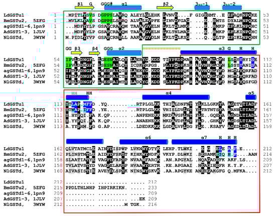 310-2 (residues 43–48), β3 (residues 56–59), β4 (residues 62–64), and α2 (residues 67–77). Then the linker coil (residues 78–88) connects the N-term domain to the C-term domain. The C-term domain consists of five helices, α3 (residues 89–119), α4 (residues 126–146), α5 (residues 158–173), α6 (residues 181–193), and α7 (residues 195–211) (Figure 2a and Figure 3). A substrate binding pocket is located between the N-term domain and the C-term domain. GSTs have been previously described as having two binding sites within the substrate binding pocket, the “G-site” which binds GSH and “H-site” which binds a hydrophobic co-substrate []. A molecular lipophilicity potential surface reveals that the LdGSTu1 substrate binding pocket has a more hydrophilic region on the N-term domain side of the binding pocket, which is bound with GSH and makes up the “G-site”, and a more lipophilic region in the substrate binding pocket adjacent to the bound GSH on the C-term domain side of the pocket making up the “H-site” (Figure 2b).