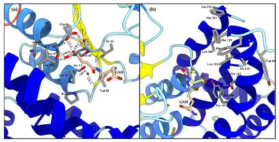 The active site of LdGSTu1 is formed by a pocket consisting of a “G-site”, which binds GSH and an “H-site” which binds a hydrophobic substrate, consistent with previously insect GST studies (Figure 2b) [,]. The “G-site” is depicted in Figure 4a with all side chains of all amino acids within 4.5 Å. The GSH is bound to LdGSTu1 via an extensive hydrogen bonding network that includes amino acid side chains, backbone carbonyls, backbone amides and crystallographic water. Ile54 and Ser64 form direct hydrogen bonding interactions with GSH (Figure 4a). Ser14, Pro55, Asn68, and Glu66 form hydrogen bonds bridged by crystallographic water molecules with GSH. The presumptive catalytic Ser14 formed a hydrogen bond with the thiol group of GSH bridged via a water molecule. Additionally, the side chain OE1 and OE2 atoms of Glu66 formed an ionic interaction with N1 atom of the bound GSH. The “H-site” of LdGSTu1 is largely hydrophobic (Figure 2b) and consists of Tyr107, Ser111, Leu115, Ala116, Phe119, Phe120, Leu208, Ala210, and Phe211 (Figure 4b).
