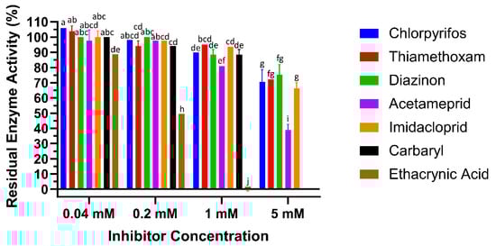 Inhibition of LdGSTu1 with ethacrynic acid (EA) and pesticides. Data points are means of independent triplicate experiments. Error bars are the calculated standard deviations of the independent triplicate experiments. Columns are color coded (see the key on right for representative colors) for the inhibitors screened and grouped into four concentrations from left to right 0.04, 0.2, 1, 5 mM. Statistical significance of residual enzyme activity among treatments was calculated using one-way ANOVA, followed by a Turkey’s HSD multiple comparation test. There was no significant difference among treatments with the same alphabetic letters (e.g., a, b, and c).