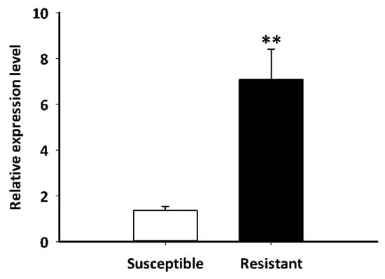 Expression patterns of LdGSTu1 in resistant and susceptible strain. The “**” indicates significant differences in gene expression at p < 0.01, according to independent Student’s t-test.
