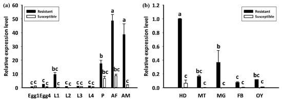 The LdGSTu1 expression levels in an insecticide resistant strain and the susceptible strain were examined. As shown in Figure 7, the relative expression level of LdGSTu1 was significantly higher in the resistant strain than the susceptible one. We then further investigated the temporal and spatial expression patterns of LdGSTu1 in both insecticide resistant and susceptible strains. The results in Figure 8a showed that during different developmental stages, LdGSTu1 was expressed at the highest level during the adults (both males and females) in the insecticide resistant strain than other stages. There were significant differences in adult expression between resistant strain and susceptible strain. The tissue expression profiles showed that LdGST1 had the highest expression levels in the head of resistant strain, followed by midgut, Malpighian tubule, and ovary in the resistant strain. There were significantly differences in head and midgut expression between resistant strain and susceptible strain (Figure 8b).