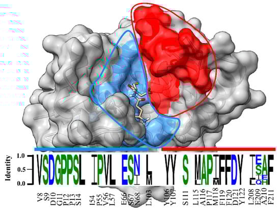 Sequence logo of amino acids in the substrate binding pocket of unclassified insect GSTs. Sequence identity is represented by the letter size. Amino acid number and type label on x-axis is representative of the LdGSTu1 sequence. The sequence logo is overlayed on a surface representation of LdGSTu1. The G-site is colored in cornflower blue and the H-site is colored in red. Residues in the sequence logo are separated by signature motifs identified in the substrate binding pocket region of LdGSTu1 upon multiple alignment with other unclassified insect GSTs. Sequences used for the multiple sequence alignment are the unclassified GST sequences from phylogenic analysis (Table S3). Sequence logo was generated with WebLogo 3 (http://weblogo.threeplusone.com/manual.html, accessed on 2 October 2021).