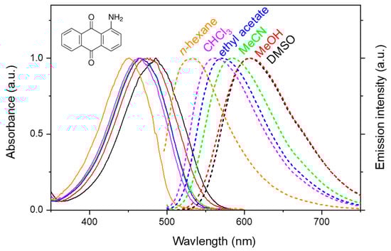 - Dahiya, P.; Kumbhakar, M.; Maity, D.K.; Mukherjee, T.; Tripathi, A.B.R.; Chattopadhyay, N.; Pal, H. Solvent polarity and intramolecular hydrogen bonding effects on the photophysical properties of 1-amino-9,10-anthraquinone dye. J. Photochem. Photobiol. A 2006, 181, 338–347. [Google Scholar] [CrossRef]