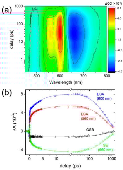 Transient absorption results of 1-aminoanthraquinone (AAQ) in DMSO with 403 nm excitation; (a) false color map and (b) kinetics for the ground state bleaching (GSB) at 485 nm, excited-state absorption (ESA) at 560 and 600 nm, and stimulated emission (SE) at 660 nm with the Gaussian-exponential fit lines.