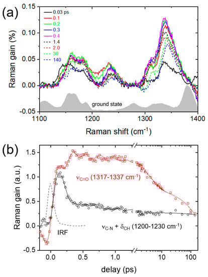 (a) FSRS of AAQ in DMSO with 403 nm excitation were compared with the ground-state spectrum; (b) the kinetic traces of the νC-N + δCH (1200–1230 cm−1) and νC=O (1317–1337 cm−1) modes. The fit results with Gaussian-convoluted exponential and damped oscillator functions were shown as solid lines and the instrument response function (IRF) of the FSRS measurements obtained from the νS=O of DMSO was also displayed.