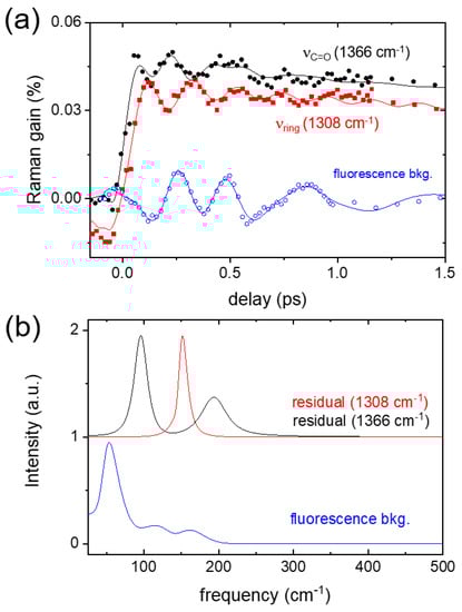 It is interesting to note that many excited-state vibrational bands include the coherent oscillation signals in the Raman intensity up to the time delay of ~1 ps. Figure 4a compares two coherent oscillation signals contained in the νring and νC=O modes of AAQ probed in a 5 cm−1 bandwidth centered at 1308 at 1366 cm−1, respectively. The vibrational intensities in these frequency ranges appear insensitive to the ultrafast TICT process (110 fs) which is presented in Figure 3b. Instead, the out-of-phase (~180°) oscillation patterns with a common frequency of (~250 fs)−1 were resolved. The coherent oscillation signals contained in both vibrational bands were retrieved from the kinetic fit with the sum of the Gaussian-convoluted exponentials and the damped oscillator functions (see Equation (S2) in the Supplementary Materials). The transient absorption signals of the sample were mostly removed via pump-probe type measurements by the Raman pump, but small amounts of the stimulated emission spectrum were still observed as the background signals in the FSRS measurements. The fluorescence background signals that are displayed together in Figure 4a were obtained at the Raman shift of 560 cm−1, where no apparent vibrational mode of the ground or excited state exists nearby. Interestingly, the fluorescence background signals also show the coherent oscillations with a slightly different frequency compared to (~250 fs)−1 in the oscillation signals of AAQ vibrational modes at 1308 and 1366 cm−1.