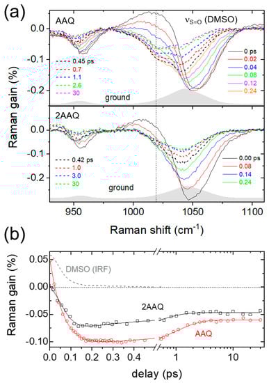 The solvent vibrational bands of DMSO also exhibit temporal changes upon the photoexcitation and instantaneous structural changes of solute molecules [,]. Figure 5a shows the transient changes in the νS=O of DMSO obtained in the FSRS measurements of AAQ and 2-aminoanthraquinone (2AAQ; see Figure S10 in the Supplementary Materials for the molecular structure) with a 403 nm excitation. The amino group in 2AAQ is located further apart from the carbonyl group than in AAQ, so the intramolecular hydrogen bonding between these groups is considered absent. At around a zero time delay, the cross-phase modulation (CPM) artifacts appear as dispersive nonlinear signals with a positive peak at 1023 and a negative peak at 1050 cm−1 (see Figure S9 in the Supplementary Materials also for the results of DMSO only), which only lasts during the pulse []. It is interesting to note that the νS=O sub-band of DMSO centered at 1020 cm−1 shows a sharp decrease in 150 fs and recovers slowly in 2–3 ps with AAQ, which is distinct from those of 2AAQ and DMSO as compared in Figure 5b. The Gaussian-convoluted exponential fit achieves a rapid rise of 60 fs from the νS=O sub-band at 1020 cm−1 with AAQ, which does not occur in the case of 2AAQ or DMSO only. The small negative intensities of 2AAQ around 1020 cm−1 at time delays of 0.1–0.3 ps can be still considered as originating from the orientational changes of DMSO molecules in the solvation shellsas the ground state νS=O modes are centered at 1040 cm−1 []. However, the presence and absence of the ultrafast (60 fs) negative spectral features centered at 1020 cm−1 between AAQ and 2AAQ exhibit the differences in the solvation dynamics of DMSO upon the ultrafast ICT or excited-state dynamics of both aminoanthraquinone isomers. The recovery of the negative νS=O sub-band intensities centered at 1020 cm−1 were also different between the AAQ and 2AAQ. While the νS=O of DMSO with 2AAQ showed a more rapid 0.5 ps decay, the recovery of AAQ appeared slower with the time constant of 1.0 ps. The recovery of the νS=O intensities of DMSO with AAQ and 2AAQ are related to the vibrational relaxation dynamics of solute molecules, where the slower solvation dynamics of 1.0 ps observed for AAQ is considered strongly related to the structural changes of AAQ upon the TICT in the excited state. As previously reported with hydroxyanthraquinones in DMSO, the long-lasting negative features in the νS=O of DMSO with AAQ and 2AAQ in the time delays of 10 ps or later are considered as the vibrationally hot Stokes Raman bands of DMSO [].