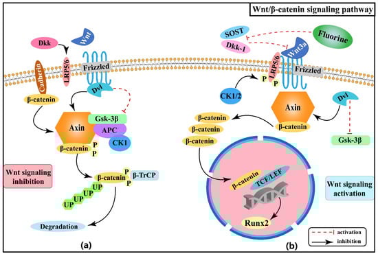 Sun et al. confirmed that fluoride significantly increased osteoblast activity, as evidenced by the observed enhanced osteogenesis in their study []. Fluoride increased the expression of Wnt3a and β-catenin in rat osteoblasts; in addition, serum bone alkaline phosphatase (BALP) levels tended to increase with increasing doses of fluoride staining [], suggesting that fluoride may be involved in the bone formation process by stimulating Wnt3a to up-regulate BALP expression. A recent study also found that fluoride can induce abnormal activation of the Wnt/β-catenin signaling pathway, causing the increased formation of cancerous bone in mice and protein expression of Wnt3a and phospho-Gsk-3β, as well as its downstream target gene Runt-related transcription factor 2 (Runx2). However, it must be noted that inhibition of β-catenin can suppress fluoride-induced Runx2 protein expression and resulting osteopathology [], which suggests that β-catenin may be a key molecule in fluoride-induced aberrant osteogenesis. Serum sclerosing protein (SOST) and dickkopf-related protein 1 (Dkk-1) are inhibitors of Wnt/β-catenin signaling, and Wang [], Liu [], and Zeng et al. [] have demonstrated that long-term or high-concentration exposure to fluoride can reduce SOST and Dkk-1 concentration, thereby inducing the activation of Wnt/β-catenin signaling, and finally leading to the progression and differentiation of osteoblasts. Figure 1 shows the association between Wnt/β-catenin signaling pathway and the pathogenesis of skeletal fluorosis.