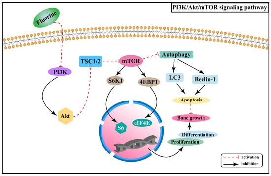 mTOR is a serine/threonine-protein kinase that can regulate a variety of biological processes. PI3K/Akt/mTOR signaling pathway is involved in the proliferation and differentiation of osteoblasts, osteoclasts, and chondrocytes [,,]. Experiments in rats with chronic fluorosis have shown that the PI3K/Akt signaling may cause excessive proliferation and differentiation of osteoblasts and accelerate bone turnover, resulting in osteosclerotic skeletal fluorosis []. It was found that high-dose fluorine can inhibit the expression of mTOR protein in cartilage tissue, promote the expression of autophagy signature proteins, such as Beclin-1 and cytoplasm-associated protein light chain 3 (LC3), and enhance the apoptosis involved in the process of fluorine-induced cartilage damage []. After mTOR is activated, it phosphorylates the downstream target proteins ribosomal protein S6 kinase β-1 (S6K1) and eukaryotic translation initiation factor 4E binding protein 1 (4EBP1) to promote gene transcription and protein translation []. Fluorine can down-regulate PI3K/Akt/mTOR signaling and inhibit the phosphorylation of its downstream factors S6K1 and 4EBP1, thus promoting chondrocyte autophagy and inhibiting chondrocyte proliferation and differentiation []. The association between PI3K/Akt/mTOR signaling pathway and the pathogenesis of skeletal fluorosis is shown in Figure 3.