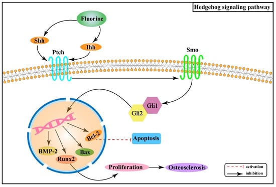 Studies have revealed that fluoride stimulation increases the expression of Ihh in rat osteoblasts, and this signal, mediated by Smo, induces the expression of Runx2 after activating Gli2, which in turn promotes osteoblast proliferation and contributes to osteosclerosis []. Moreover, fluorine stimulation can cause chondrocytes to produce oxygen radicals, thus causing abnormal differentiation [,]. Shh is stimulated and released when oxidative stress occurs, synergizing with oxidative stress to promote the B cell lymphoma/leukemia-2 (Bcl-2) anti-apoptotic protein []. Animal experiments demonstrated that with the expression of Shh, Smo, bone morphogenetic protein-2 (BMP-2) and B cell lymphoma/leukemia gene associated × (Bax) protein gradually increased in rat cartilage tissues with increasing fluoride staining concentration, while Bcl-2 protein expression gradually decreased []. Figure 4 shows the association between Hh signaling pathway and the pathogenesis of skeletal fluorosis.
