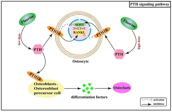 Over the years, systematic studies of the mechanisms of fluorosis in animals and humans have revealed that many calcium-regulating hormones and cytokines are also involved in mediating abnormal osteogenic and osteolytic bone metabolism in skeletal fluorosis, such as parathyroid hormone (PTH) and transforming growth factor β (TGF-β). PTH is a polypeptide hormone responsible for regulating calcium homeostasis in the body and exerts an active role in regulating bone turnover. Its effects on cells are mediated by the G protein-coupled receptor (PTH receptor, PTH1R) expressed by target cells, including osteoblasts, osteoblast precursor cells, and osteocytes, but excluding osteoclasts [,]. Therefore, PTH acts indirectly on osteoclasts by binding to PTH1R on the surface of the osteoblast cell line and secreting osteoclast differentiation factors. Additionally, a study found that serum PTH levels gradually increased with increasing fluoride exposure []. PTH can regulate fluoride action through its effects on the expression of SOST and receptor activator of nuclear factor-κB ligand (RANKL) in osteocytes. By up-regulating RANKL and inhibiting SOST, PTH enhances the effectiveness of low-dose of fluoride in bone turnover promotion while having opposite effects on SOST and RANKL in the cases of high fluoride doses []. Figure 5 shows the association between PTH signaling pathway and the pathogenesis of skeletal fluorosis.