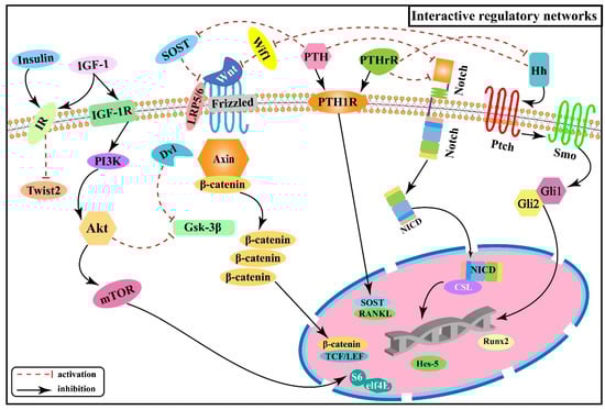 In the pathogenetic progression of skeletal fluorosis, both local signaling pathways and hormones are involved. Activation or inhibition of signaling is not accomplished linearly within the single signaling pathway mentioned above alone, but rather the signaling pathways interact to form an interactive regulatory network that acts to control biological processes in a synergistic or antagonistic manner []. Figure 6 illustrates the interactive regulatory networks formed among Wnt/β-catenin, Notch, PI3K/Akt/mTOR, Hh, PTH, and insulin signaling pathways involved in skeletal fluorosis.