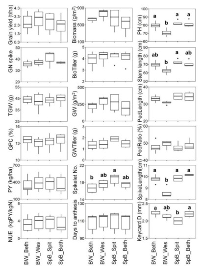 Box plots of yield-related traits of three parental lines in BW and SpB populations. GN: grain number; TGW: thousand grain weight; GPC: grain protein content; PY: protein yield; NUE: nitrogen use efficiency; Biomass: plant biomass per m2; BioTiller: biomass per tiller; GW: grain weight; GWTiller: grain weight per tiller; Spikelet No.: spikelet number per spike; PH: plant height; PedLength: peduncle length; PedRatio: peduncle ratio; Keycard D: keycard diameter; Beth: Bethlehem; Wes: Westonia; Spit: Spitfire. Values with the same letter or without letter are statistically not different at p = 0.05.