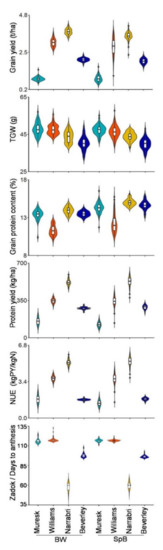 Violin plots of yield-related traits and grain protein content of BW and SpB populations. TGW: thousand grain weight; NUE: nitrogen use efficiency.