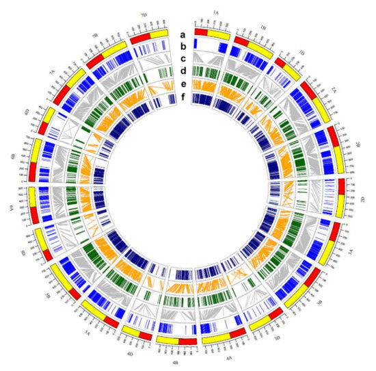 The circos graph of the consensus map of BW–SpB, the consensus map of Wang et al. (2014), and the physical map of the wheat genome (IWGSC RefSeq v1.0). (a) The chromosomes and the physical location scale of wheat. (b) Physical map of the SNP markers using in BW–SpB. (c) The collinearity between the consensus map of BW–SpB and the physical map. (d) The consensus map of BW–SpB. (e) The collinearity between BW–SpB and the consensus map of Wang et al. (f) The consensus map of Wang et al. (2014).