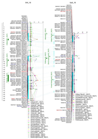 Significant QTL formed three QTL clusters on the homologous region on 1B in both populations, BW and SpB. Homologous regions in both populations are highlighted in light blue; markers for QTL highlighted in red; homologous markers highlighted in blue.