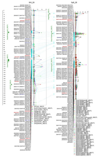Significant QTL formed three QTL clusters on the homologous regions on 2B in BW and SpB populations. Homologous regions in both populations are highlighted in light blue; markers for QTL highlighted in red; homologous markers in blue.
