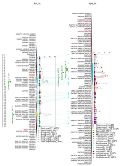 Significant QTL formed two QTL clusters on 3A—one on the homologous region on 3A—in both populations, BW and SpB. Homologous regions in both populations are highlighted in light blue; the QTL cluster on one population is highlighted in yellow; markers for QTL are highlighted in red; homologous markers are highlighted in blue.