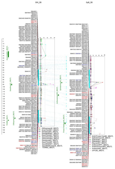 Two QTL clusters were identified on 5B (Figure 9 and Table S6). One cluster (5B.1) was between 5BM78354 and 5BM11567 (55.1–95.2 cM, 368.5–533.0 Mb) containing 1800 genes. The QTL of Spikelet and Keycard were attributed to Spitfire; and the seed area, seed width, and thickness by Westonia. Another cluster (5B.2) was between 5BM46778 and 5BM39285 (156.0-183.7, 613.6–701.5 Mb) including 1302 genes. The QTL of anthesis, NUE/PY, and one GPC were contributed by Spitfire; and the TGW, seed area, seed thickness and seed width by Westonia. The QTL of GW and another GPC were attributed to Bethlehem in BW and SpB populations, respectively. Interestingly, one GPC QTL was parallel with the QTL of days to anthesis, and both were contributed by Spitfire. This result is against the normal findings that the high GPC level is concomitant with the early anthesis.