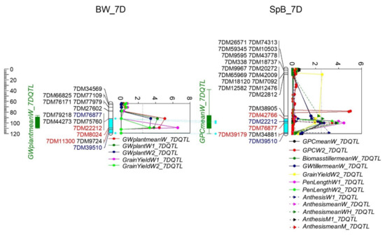 Significant QTL formed one QTL cluster on the homologous region on 7D in both populations, BW and SpB. Homologous regions in both populations are highlighted in light blue; markers for QTL highlighted in red; homologous markers highlighted in blue.